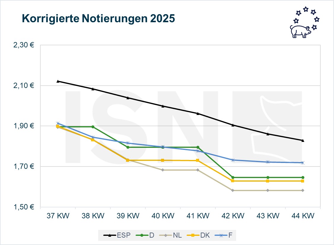 Der europäische Schlachtschweinemarkt setzt den Trend zur Stabilisierung weitgehend fort. Die Notierungen der großen Schweine haltenden EU-Länder bewegen sich überwiegend seitwärts. Die spanische Notierung schwächelt dabei weiter und nähert sich dem europäischen Mittelfeld weiter an.
