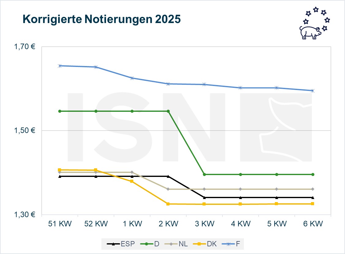 Der europäische Schlachtschweinemarkt bleibt überwiegend unverändert und viele Notierungen zeigen sich unbeweglich. Aber es gibt Ausnahmen: Während die belgische Notierung sogar leicht anzieht, setzt der italienische Markt den bestehenden Trend zur Schwäche weiter fort.