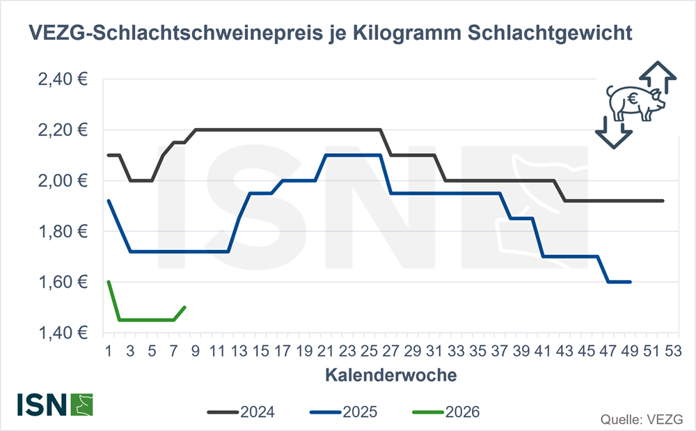 Am heutigen Mittwoch wurde die Notierung der Vereinigung der Erzeugergemeinschaften für Vieh und Fleisch (VEZG) um 5 Cent auf 1,50 €/kg SG angehoben. Damit spiegelt sich die zuletzt freundlichere Tendenz am Schlachtschweinemarkt nun auch in der Preisfindung wider. Wenngleich die Kostendeckung noch längst nicht erreicht ist, ist dies ein erster wichtiger Schritt für die Schweinehalter, um nach einer längeren Phase wirtschaftlicher Belastung wieder Perspektive zu gewinnen.