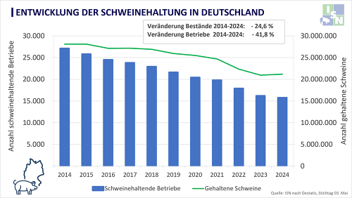 Kürzlich hat das Statistische Bundesamt (Destatis) die endgültigen Ergebnisse der Viehzählung vom 03. Mai 2024 veröffentlicht. Insgesamt ergab sich dabei ein leichter Anstieg des deutschen Schweinebestandes um 1,1 % auf 21,2 Mio. Tiere im Vergleich zur Vorjahreszählung. Der langjährige Trend der rückläufigen Betriebszahlen setzt sich aber weiter fort.