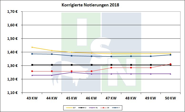 Die französische Notierung legte aus politischen Gründen leicht (+1 Cent) zu, kommentierte ein französischer Marktteilnehmer. Vielmehr stünde die Sorge einiger Schlachtbetriebe vor drohenden Protesten der Landwirte und Blockaden im Vordergrund. In Großbritannien gab die Notierung aufgrund eines ausreichen versorgen Marktes leicht nach.