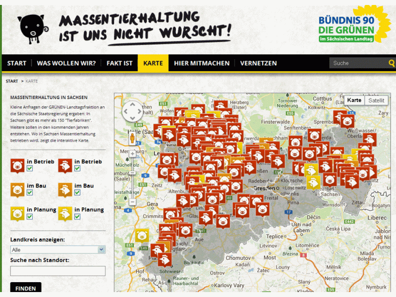 Die Grünen in Sachsen haben auf ihrer Internetseite www.massentierhaltung-sachsen.de die Standorte der genehmigten Tierhaltungsanlagen und diejenigen, die eine Genehmigung beantragt haben, in einer Karte veröffentlicht. Angegeben wird für jede dieser gut 150 Tierhaltungsanlagen in Sachsen jeweils die genaue Bezeichnung des Betreibers, die Produktionsausrichtung, die Zahl der genehmigten bzw. beantragten Plätze und der jeweilige Standort (Postleitzahl und Ort). Das Ganze wird begleitet von Parolen und Wahlkampfgetöse gegen die Tierhaltung mit den alten, abgekauten und nicht stimmigen Argumenten insbesondere zum Thema Tierschutz.