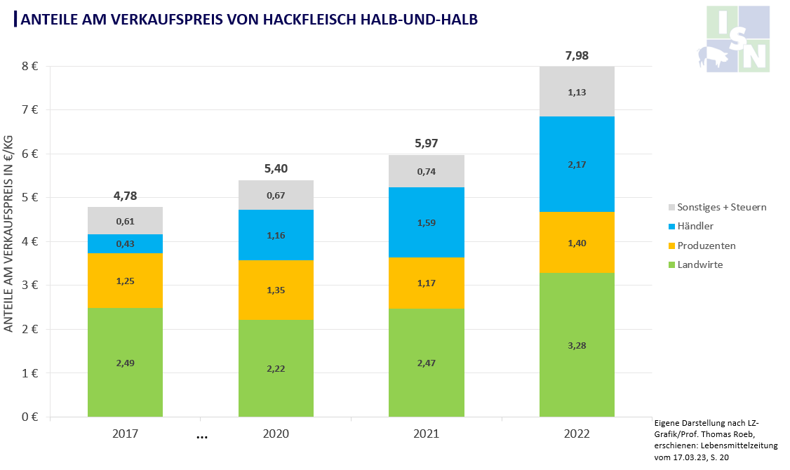 Der LEH hat seinen Anteil am Verbrauchspreis von Hackfleisch halb-und-halb in den letzten Jahren deutlich erhöht. © Eigene Darstellung nach LZ-Grafik/Prof. Thomas Roeb, erschienen in Lebensmittelzeitung vom 17.03.2023, S.20