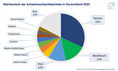 Auf dem zweiten Rang folgt das genossenschaftlich organisierte Unternehmen Westfleisch, welches sich 2023 dem Trend des stark rückläufigen Gesamtmarktes größtenteils entziehen konnte. Mit 6,50 Mio. Schweinen schlachtete Westfleisch fast genauso viele Tiere wie im Vorjahr (-0,2 %) und steigerte den Marktanteil dadurch von 13,8 % auf 14,8 %.