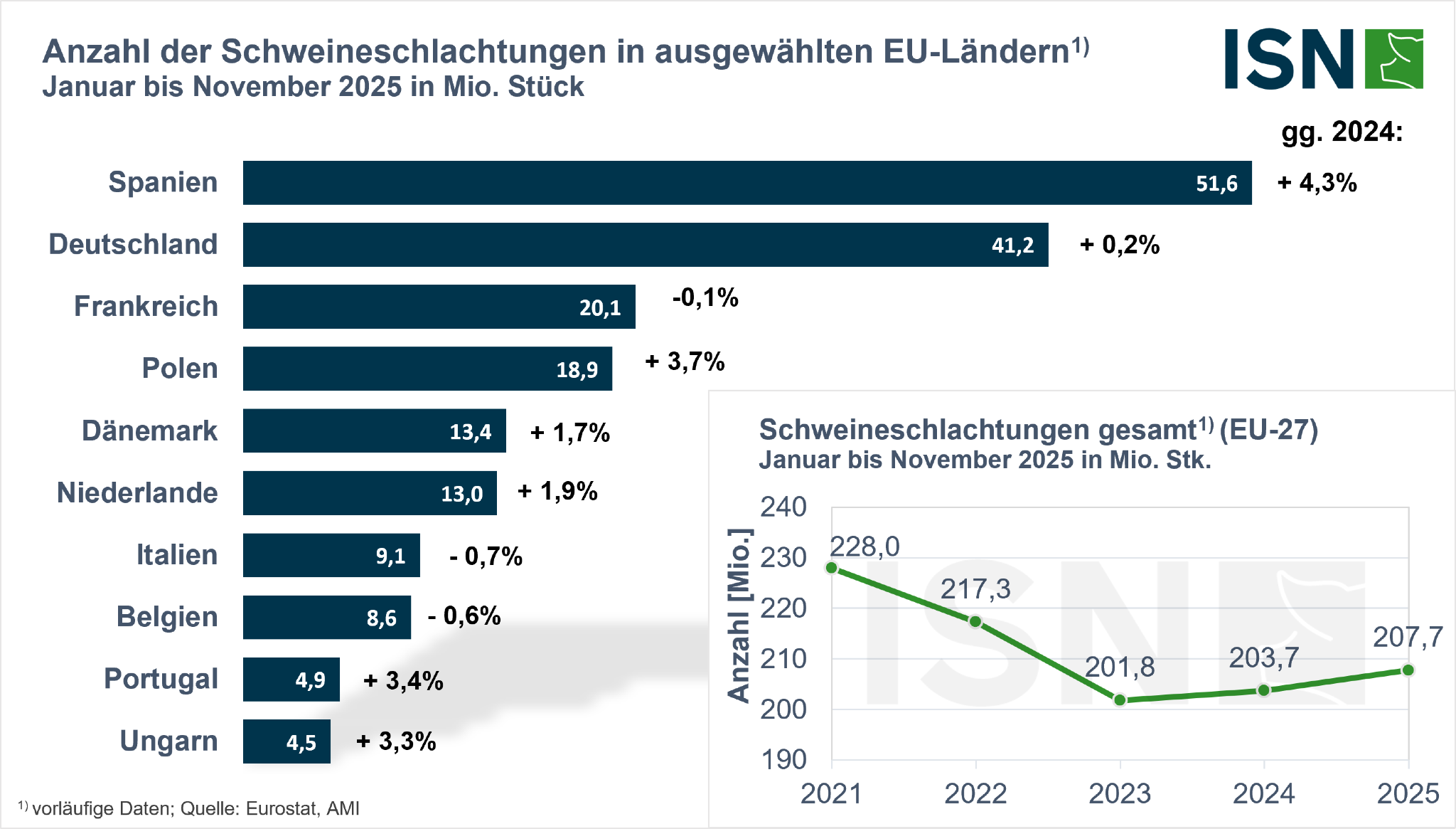 Im Zeitraum von Januar bis November 2025 haben die Schweineschlachtungen in der Europäischen Union gegenüber dem Vorjahr zugenommen. Nach vorläufigen Zahlen von Eurostat wurden insgesamt rund 207,7 Mio. Schweine geschlachtet, was einem Anstieg um 2,0 % gegenüber dem Vorjahreszeitraum entspricht. Die erzeugte Schlachtmenge erhöhte sich aufgrund höherer Schlachtgewichte um 3,1 % auf etwa 19,95 Mio. t.