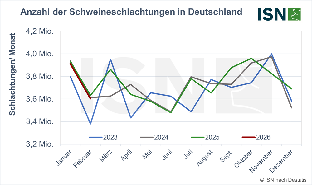 In den ersten beiden Monaten 2026 sind die Schweineschlachtungen in Deutschland leicht zurückgegangen. Die Anlieferung von Schweinen aus dem Ausland ging deutlich zurück.
