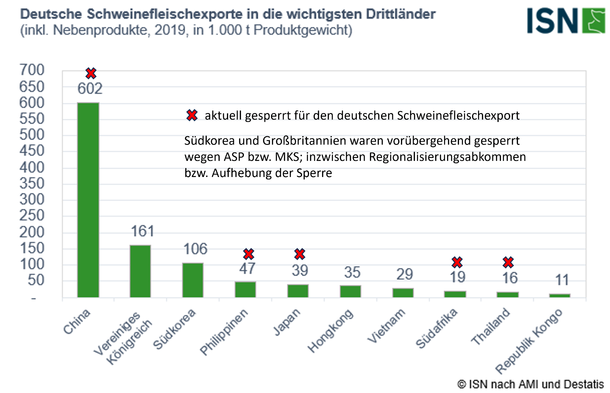 Mit dem erstmaligen Auftreten der ASP in Deutschland im Jahr 2020 verhängten diverse Länder Einfuhrsperren gegen deutsches Schweinefleisch. Seitdem gingen die Drittlandsexporte von ehemals 1,18 Mio. t (im Jahr 2019) auf aktuell 335.000 t (im Jahr 2025) zurück, was einem Einbruch von 72 % entspricht. Zu den wichtigsten Zielländern außerhalb der EU zählen China, Großbritannien und Südkorea, Japan und Thailand. Nach Großbritannien konnte der Export trotz ASP weiterlaufen und mit Südkorea konnte ein Regionalisierungsabkommen ausgehandelt werden, sodass die Lieferungen dorthin im November 2023 wieder anliefen. Zwischenzeitlich gab es weitere Sperren aus Großbritannien und Südkorea durch die Maul- und Klauenseuche, diese sind mittlerweile aber wieder aufgehoben.