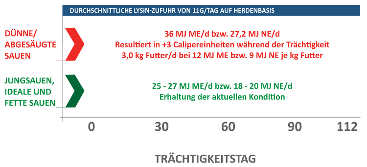 - Eine Sau soll während der gesamten Trächtigkeit nicht weniger als 25 MJ ME bzw. 18,4 MJ NE pro Tag erhalten. Dies wird ihre Kondition nicht schnell anpassen, könnte aber die Langlebigkeit beeinträchtigen.