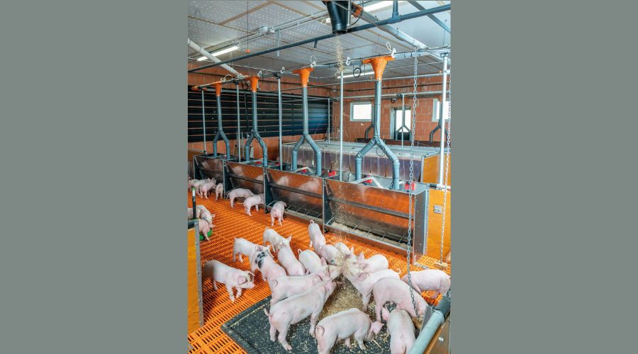 Schweine wollen beschäftigt sein. Daher stellt Landwirt Behnen seinen Tieren Beißholz, an Seilen aufgehängte Jutesäcke und natürlich Raufutter zur Verfügung. Das organische Material (in diesem Fall Stroh) wird außerhalb des Stalls in einem Raufutterdosierer bevorratet, automatisch in den Stall transportiert und dort ausdosiert.