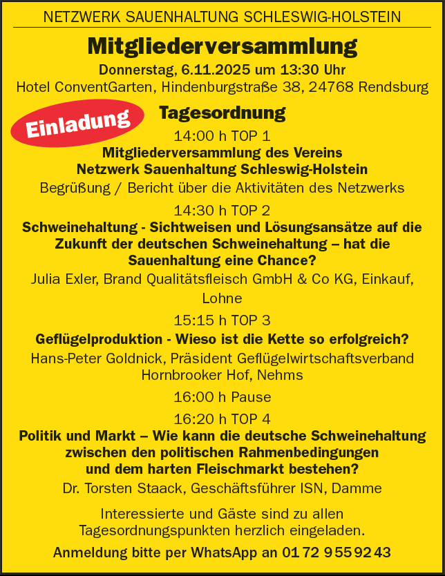 - 14.00 Uhr: Mitgliederversammlung des Vereins Netzwerk Sauenhaltung Schleswig-Holstein